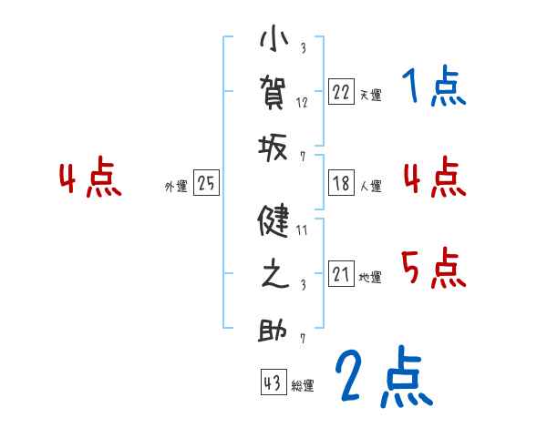 総運![]() | 小賀坂健之助さんの総運は43画の2つ星!頑固な性格で独立心が強いかも。やや非現実的で浪費に注意しましょう。 あなたの人生を表す1番重要な運勢です。生涯を通じて影響する総合運となり、主に50歳以降の晩年期に影響を及ぼします。 |