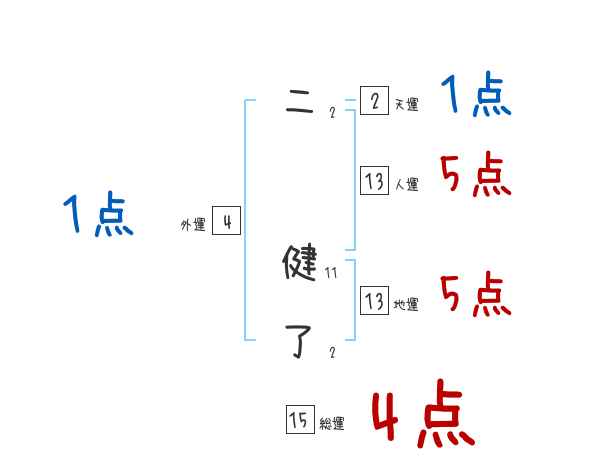 天運![]() | 二健了さんの天運は2画の1つ星!優しいですが積極性や意思の強さに欠ける傾向があります。家庭環境の乱れに注意しましょう。 家系が持つ宿命的な運勢を表します。祖先から受け継いだ苗字ですので自分の力が及びません。家柄を象徴します。 |