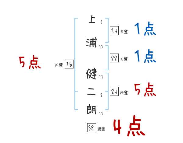 外運![]() | 上浦健二朗さんの外運は16画の5つ星!人望が厚く大きく発展する。逆転成功が見える。 生活面を象徴する運勢です。外部から受ける影響力を表し、結婚運、家庭運や職場、環境への順応性を表します。 |