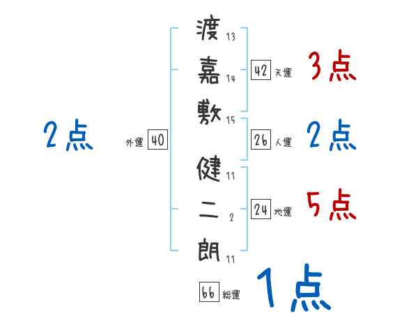人運![]() | 渡嘉敷健二朗さんの人運は26画の2つ星!波瀾万丈かも。信頼できる人を大事にしましょう。 性格や才能などを表す2番目に重要な運勢です。人間関係や協調性、社会的な成功に影響します。主に20歳から50歳ぐらいまでの中年期の運勢を表します。 |