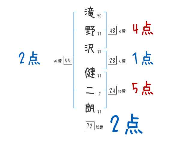 天運![]() | 滝野沢健二朗さんの天運は48画の4つ星!賢明な性格で人望が厚い。指導力があり多くの人に尊敬される。 家系が持つ宿命的な運勢を表します。祖先から受け継いだ苗字ですので自分の力が及びません。家柄を象徴します。 |