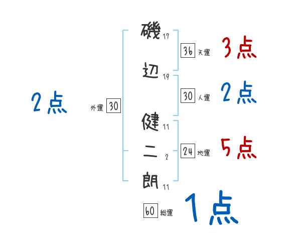 外運![]() | 磯辺健二朗さんの外運は30画の2つ星!浮き沈みの激しさに注意しましょう。 生活面を象徴する運勢です。外部から受ける影響力を表し、結婚運、家庭運や職場、環境への順応性を表します。 |