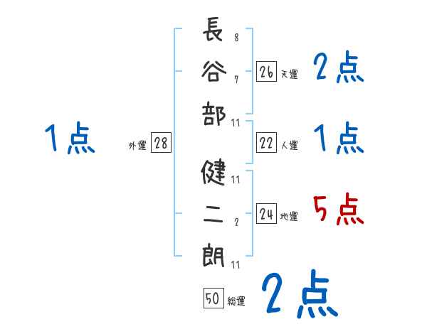 天運![]() | 長谷部健二朗さんの天運は26画の2つ星!波瀾万丈かも。信頼できる人を大事にしましょう。 家系が持つ宿命的な運勢を表します。祖先から受け継いだ苗字ですので自分の力が及びません。家柄を象徴します。 |