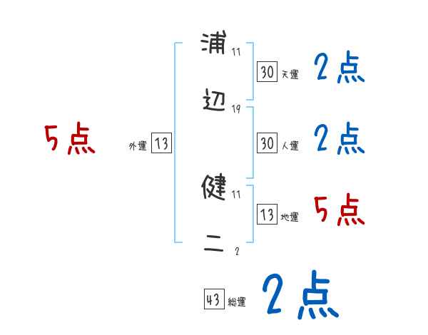 天運![]() | 浦辺健二さんの天運は30画の2つ星!浮き沈みの激しさに注意しましょう。 家系が持つ宿命的な運勢を表します。祖先から受け継いだ苗字ですので自分の力が及びません。家柄を象徴します。 |