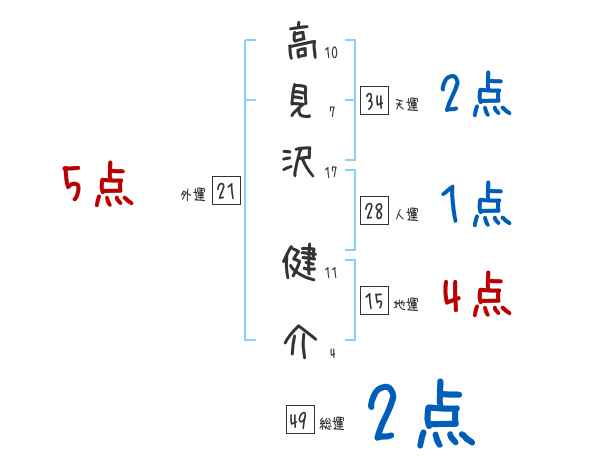 外運![]() | 高見沢健介さんの外運は21画の5つ星!統率力がある。独立し成功する。名誉を手に入れる。 生活面を象徴する運勢です。外部から受ける影響力を表し、結婚運、家庭運や職場、環境への順応性を表します。 |