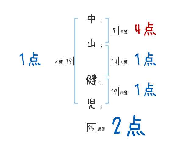 天運![]() | 中山健児さんの天運は7画の4つ星!強い意志や信念を持ち独立心が強い。自立する。 家系が持つ宿命的な運勢を表します。祖先から受け継いだ苗字ですので自分の力が及びません。家柄を象徴します。 |