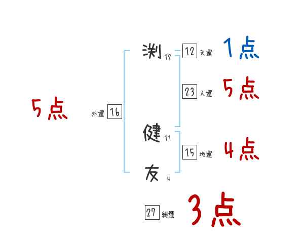 人運![]() | 渕健友さんの人運は23画の5つ星!想像力に優れ活力がある。一代で成功し名誉を手に入れる。 性格や才能などを表す2番目に重要な運勢です。人間関係や協調性、社会的な成功に影響します。主に20歳から50歳ぐらいまでの中年期の運勢を表します。 |