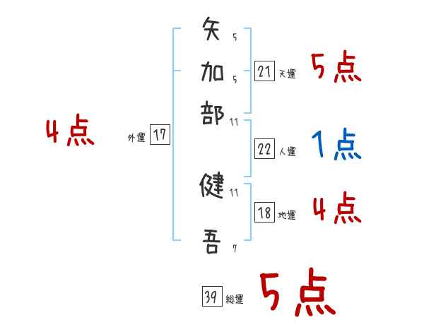 外運![]() | 矢加部健吾さんの外運は17画の4つ星!積極的な行動力。地位を気づき財産を手に入れる。純粋な心と直感力。 生活面を象徴する運勢です。外部から受ける影響力を表し、結婚運、家庭運や職場、環境への順応性を表します。 |