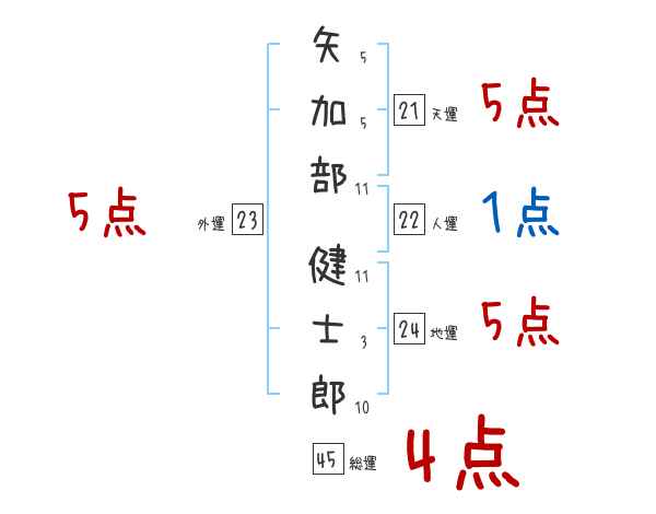総運![]() | 矢加部健士郎さんの総運は45画の4つ星!もくもくと物事を進め達成する。地味な努力家。 あなたの人生を表す1番重要な運勢です。生涯を通じて影響する総合運となり、主に50歳以降の晩年期に影響を及ぼします。 |