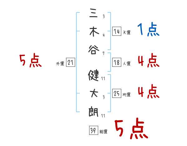 外運![]() | 三木谷健大朗さんの外運は21画の5つ星!統率力がある。独立し成功する。名誉を手に入れる。 生活面を象徴する運勢です。外部から受ける影響力を表し、結婚運、家庭運や職場、環境への順応性を表します。 |