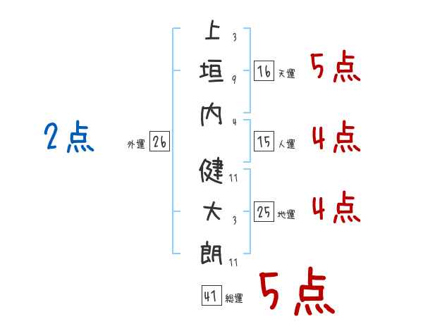 天運![]() | 上垣内健大朗さんの天運は16画の5つ星!人望が厚く大きく発展する。逆転成功が見える。 家系が持つ宿命的な運勢を表します。祖先から受け継いだ苗字ですので自分の力が及びません。家柄を象徴します。 |