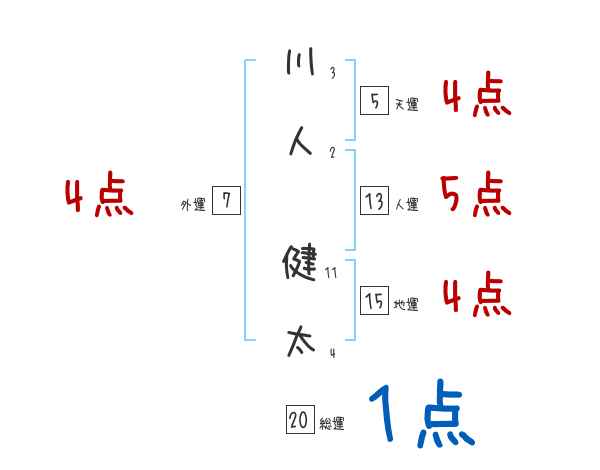 天運![]() | 川人健太さんの天運は5画の4つ星!健康で安泰。協調性に優れ、財産に恵まれる。 家系が持つ宿命的な運勢を表します。祖先から受け継いだ苗字ですので自分の力が及びません。家柄を象徴します。 |