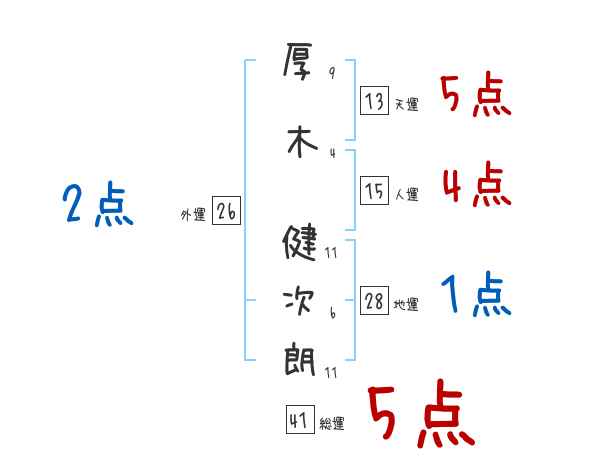 天運![]() | 厚木健次朗さんの天運は13画の5つ星!才能に恵まれ人気がある。名声を手に入れる。円満な人生。 家系が持つ宿命的な運勢を表します。祖先から受け継いだ苗字ですので自分の力が及びません。家柄を象徴します。 |