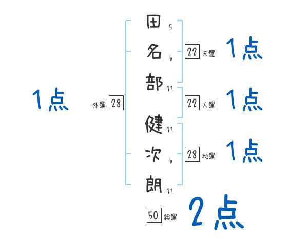 総運![]() | 田名部健次朗さんの総運は50画の2つ星!浮き沈みが激しく不安定。しりすぼみに衰退しやすいので注意しましょう。 あなたの人生を表す1番重要な運勢です。生涯を通じて影響する総合運となり、主に50歳以降の晩年期に影響を及ぼします。 |