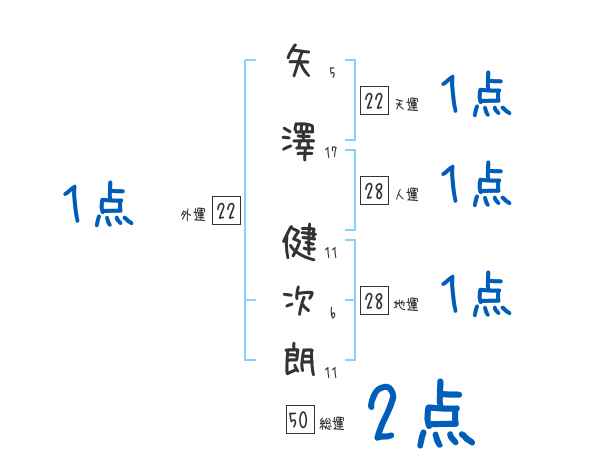 天運![]() | 矢澤健次朗さんの天運は22画の1つ星!努力することが苦手ないっぽう手先が器用。芸術性にも優れる。 家系が持つ宿命的な運勢を表します。祖先から受け継いだ苗字ですので自分の力が及びません。家柄を象徴します。 |