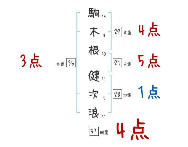 総運![]() | 駒木根健次浪さんの総運は57画の4つ星!向上心があり人望がある。地位を得る。 あなたの人生を表す1番重要な運勢です。生涯を通じて影響する総合運となり、主に50歳以降の晩年期に影響を及ぼします。 |
