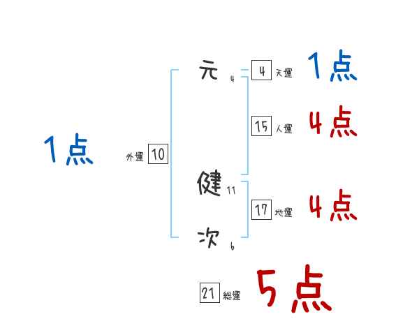 天運![]() | 元健次さんの天運は4画の1つ星!感情が不安定で苦労するかも。周囲との協調を心掛けましょう。 家系が持つ宿命的な運勢を表します。祖先から受け継いだ苗字ですので自分の力が及びません。家柄を象徴します。 |