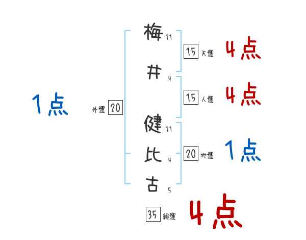 総運![]() | 梅井健比古さんの総運は35画の4つ星!温厚な性格で感受性が高い。穏和な性格で人望が厚い。 あなたの人生を表す1番重要な運勢です。生涯を通じて影響する総合運となり、主に50歳以降の晩年期に影響を及ぼします。 |