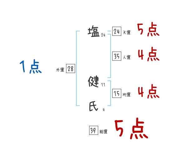 天運![]() | 塩健氏さんの天運は24画の5つ星!家庭運が良く順調な人生。金運にも恵まれる。 家系が持つ宿命的な運勢を表します。祖先から受け継いだ苗字ですので自分の力が及びません。家柄を象徴します。 |