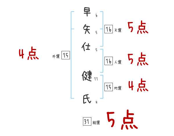 人運![]() | 早矢仕健氏さんの人運は16画の5つ星!人望が厚く大きく発展する。逆転成功が見える。 性格や才能などを表す2番目に重要な運勢です。人間関係や協調性、社会的な成功に影響します。主に20歳から50歳ぐらいまでの中年期の運勢を表します。 |
