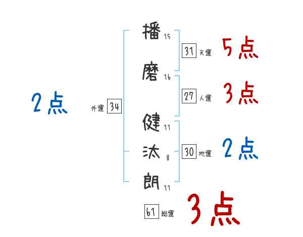 外運![]() | 播磨健汰朗さんの外運は34画の2つ星!独創性に優れるが、自尊心が強く災難に注意しましょう。 生活面を象徴する運勢です。外部から受ける影響力を表し、結婚運、家庭運や職場、環境への順応性を表します。 |