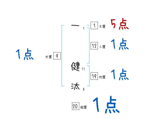 天運![]() | 一健汰さんの天運は1画の5つ星!行動力、指導力があり出世し繁栄する。幸運に恵まれる。 家系が持つ宿命的な運勢を表します。祖先から受け継いだ苗字ですので自分の力が及びません。家柄を象徴します。 |