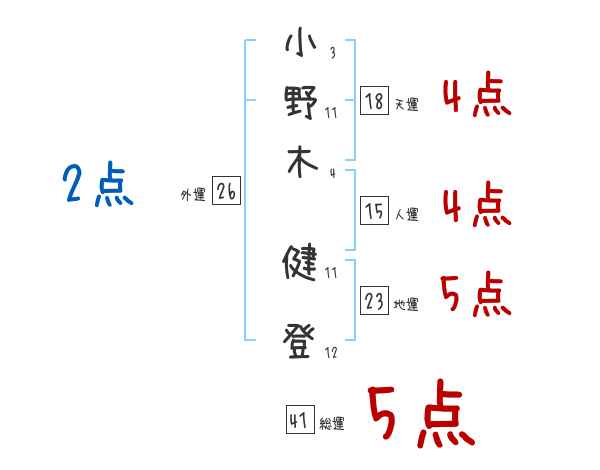 天運![]() | 小野木健登さんの天運は18画の4つ星!情熱的で剛気。忍耐力があり信頼される。 家系が持つ宿命的な運勢を表します。祖先から受け継いだ苗字ですので自分の力が及びません。家柄を象徴します。 |