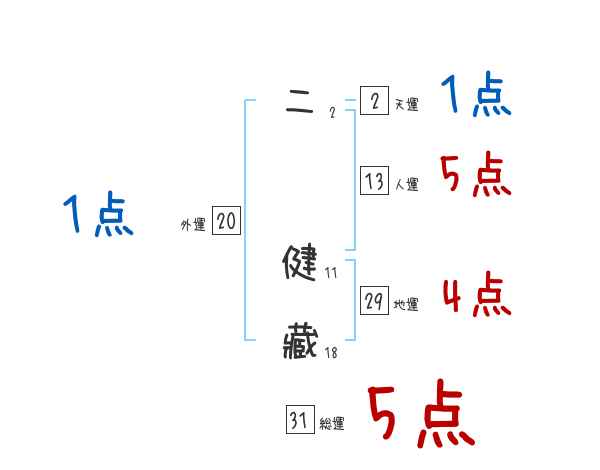 天運![]() | 二健藏さんの天運は2画の1つ星!優しいですが積極性や意思の強さに欠ける傾向があります。家庭環境の乱れに注意しましょう。 家系が持つ宿命的な運勢を表します。祖先から受け継いだ苗字ですので自分の力が及びません。家柄を象徴します。 |