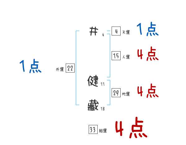 天運![]() | 井健藏さんの天運は4画の1つ星!感情が不安定で苦労するかも。周囲との協調を心掛けましょう。 家系が持つ宿命的な運勢を表します。祖先から受け継いだ苗字ですので自分の力が及びません。家柄を象徴します。 |