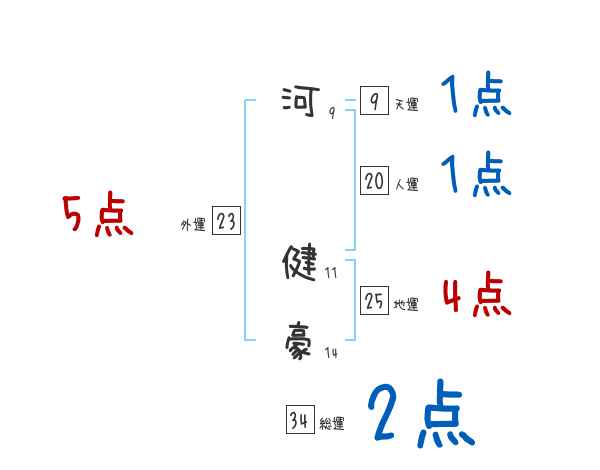 外運![]() | 河健豪さんの外運は23画の5つ星!想像力に優れ活力がある。一代で成功し名誉を手に入れる。 生活面を象徴する運勢です。外部から受ける影響力を表し、結婚運、家庭運や職場、環境への順応性を表します。 |