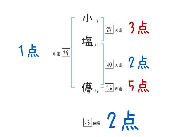総運![]() | 小塩儚さんの総運は43画の2つ星!頑固な性格で独立心が強いかも。やや非現実的で浪費に注意しましょう。 あなたの人生を表す1番重要な運勢です。生涯を通じて影響する総合運となり、主に50歳以降の晩年期に影響を及ぼします。 |