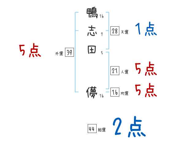 外運![]() | 鴨志田儚さんの外運は39画の5つ星!社交性に優れ人望が厚い。人の上に立ち成功する。 生活面を象徴する運勢です。外部から受ける影響力を表し、結婚運、家庭運や職場、環境への順応性を表します。 |