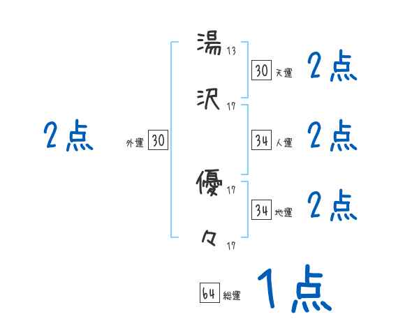 天運![]() | 湯沢優々さんの天運は30画の2つ星!浮き沈みの激しさに注意しましょう。 家系が持つ宿命的な運勢を表します。祖先から受け継いだ苗字ですので自分の力が及びません。家柄を象徴します。 |