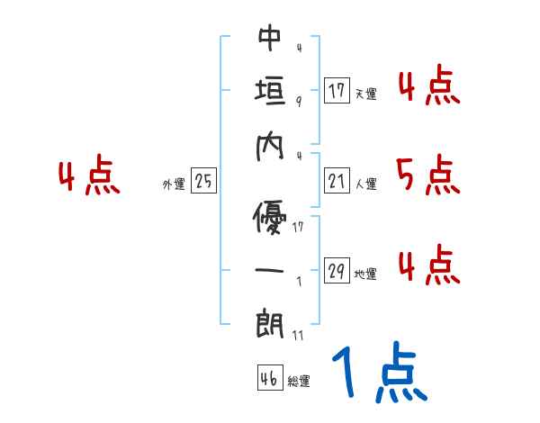 天運![]() | 中垣内優一朗さんの天運は17画の4つ星!積極的な行動力。地位を気づき財産を手に入れる。純粋な心と直感力。 家系が持つ宿命的な運勢を表します。祖先から受け継いだ苗字ですので自分の力が及びません。家柄を象徴します。 |