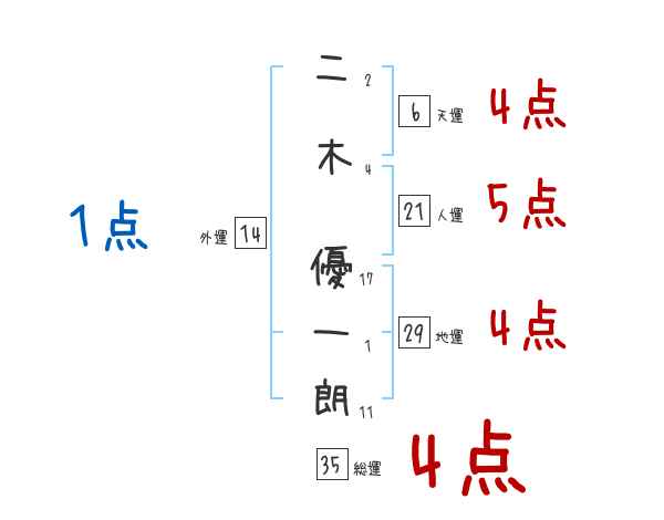 天運![]() | 二木優一朗さんの天運は6画の4つ星!慎重な努力家で信頼を得る。誠実な精神で向上心に優れる。 家系が持つ宿命的な運勢を表します。祖先から受け継いだ苗字ですので自分の力が及びません。家柄を象徴します。 |