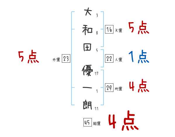総運![]() | 大和田優一朗さんの総運は45画の4つ星!もくもくと物事を進め達成する。地味な努力家。 あなたの人生を表す1番重要な運勢です。生涯を通じて影響する総合運となり、主に50歳以降の晩年期に影響を及ぼします。 |