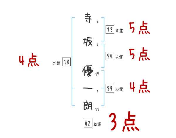 外運![]() | 寺坂優一朗さんの外運は18画の4つ星!情熱的で剛気。忍耐力があり信頼される。 生活面を象徴する運勢です。外部から受ける影響力を表し、結婚運、家庭運や職場、環境への順応性を表します。 |