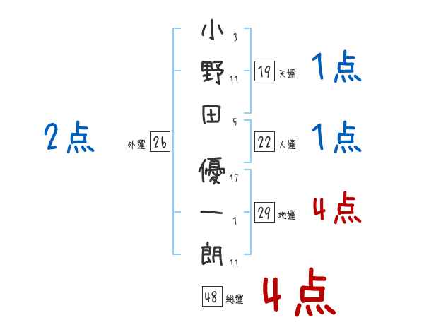 外運![]() | 小野田優一朗さんの外運は26画の2つ星!波瀾万丈かも。信頼できる人を大事にしましょう。 生活面を象徴する運勢です。外部から受ける影響力を表し、結婚運、家庭運や職場、環境への順応性を表します。 |
