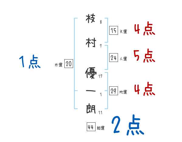 総運![]() | 枝村優一朗さんの総運は44画の2つ星!誠実で慎重な性格。物事を考えすぎないように注意しましょう。 あなたの人生を表す1番重要な運勢です。生涯を通じて影響する総合運となり、主に50歳以降の晩年期に影響を及ぼします。 |
