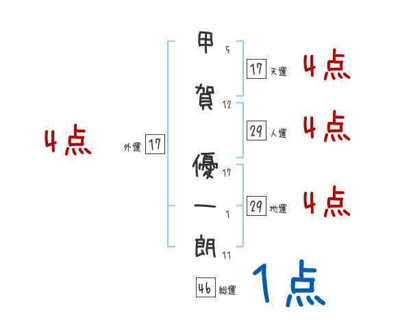 外運![]() | 甲賀優一朗さんの外運は17画の4つ星!積極的な行動力。地位を気づき財産を手に入れる。純粋な心と直感力。 生活面を象徴する運勢です。外部から受ける影響力を表し、結婚運、家庭運や職場、環境への順応性を表します。 |