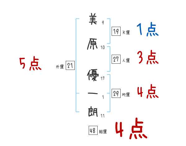 外運![]() | 美原優一朗さんの外運は21画の5つ星!統率力がある。独立し成功する。名誉を手に入れる。 生活面を象徴する運勢です。外部から受ける影響力を表し、結婚運、家庭運や職場、環境への順応性を表します。 |