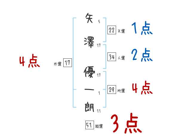 外運![]() | 矢澤優一朗さんの外運は17画の4つ星!積極的な行動力。地位を気づき財産を手に入れる。純粋な心と直感力。 生活面を象徴する運勢です。外部から受ける影響力を表し、結婚運、家庭運や職場、環境への順応性を表します。 |