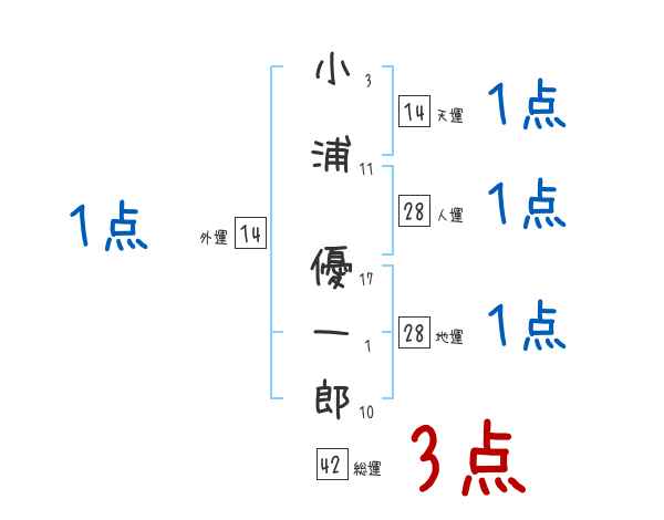 天運![]() | 小浦優一郎さんの天運は14画の1つ星!人に対して優しいがストレスを溜め込みがち。人間関係のトラブルを避けるよう気をつけましょう。 家系が持つ宿命的な運勢を表します。祖先から受け継いだ苗字ですので自分の力が及びません。家柄を象徴します。 |