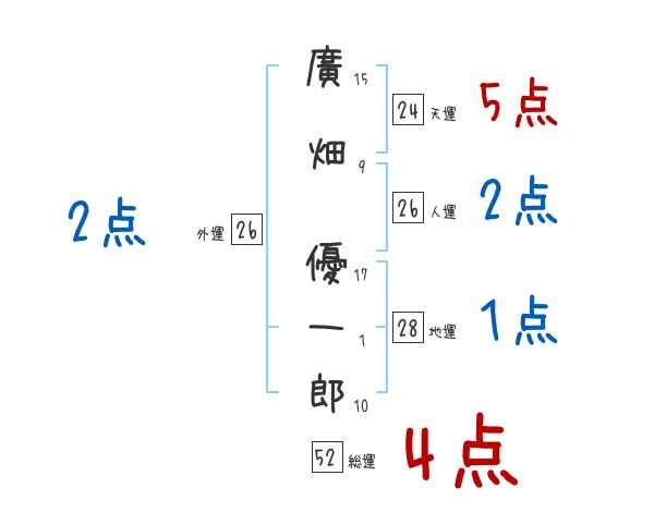 外運![]() | 廣畑優一郎さんの外運は26画の2つ星!波瀾万丈かも。信頼できる人を大事にしましょう。 生活面を象徴する運勢です。外部から受ける影響力を表し、結婚運、家庭運や職場、環境への順応性を表します。 |