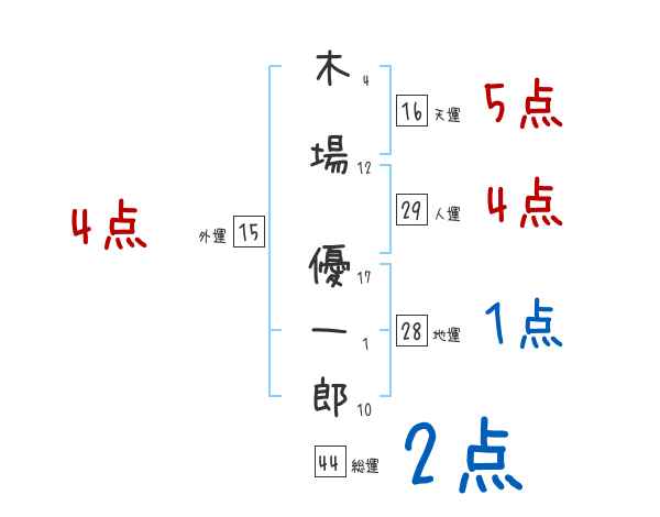 人運![]() | 木場優一郎さんの人運は29画の4つ星!完全主義で才能がある。厳格な心の持ち主。 性格や才能などを表す2番目に重要な運勢です。人間関係や協調性、社会的な成功に影響します。主に20歳から50歳ぐらいまでの中年期の運勢を表します。 |