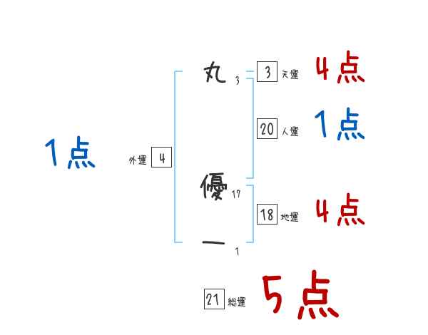 天運![]() | 丸優一さんの天運は3画の4つ星!活動的で才能に恵まれ、多くの信頼を得る。希望に満ち成長する。 家系が持つ宿命的な運勢を表します。祖先から受け継いだ苗字ですので自分の力が及びません。家柄を象徴します。 |