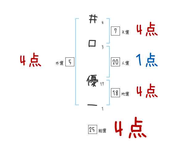 外運![]() | 井口優一さんの外運は5画の4つ星!健康で安泰。協調性に優れ、財産に恵まれる。 生活面を象徴する運勢です。外部から受ける影響力を表し、結婚運、家庭運や職場、環境への順応性を表します。 |