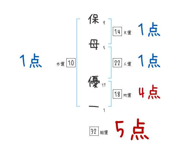 人運![]() | 保母優一さんの人運は22画の1つ星!努力することが苦手ないっぽう手先が器用。芸術性にも優れる。 性格や才能などを表す2番目に重要な運勢です。人間関係や協調性、社会的な成功に影響します。主に20歳から50歳ぐらいまでの中年期の運勢を表します。 |