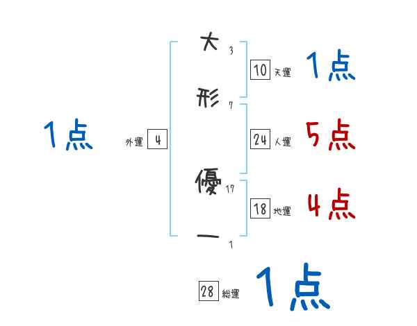 総運![]() | 大形優一さんの総運は28画の1つ星!家庭環境に注意。スポーツで活躍できる能力があるかも。 あなたの人生を表す1番重要な運勢です。生涯を通じて影響する総合運となり、主に50歳以降の晩年期に影響を及ぼします。 |