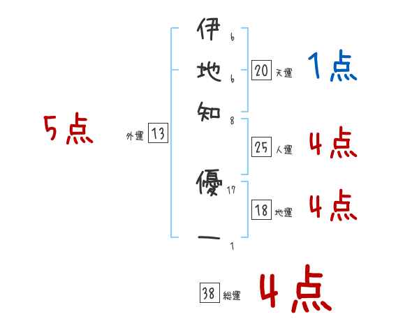 外運![]() | 伊地知優一さんの外運は13画の5つ星!才能に恵まれ人気がある。名声を手に入れる。円満な人生。 生活面を象徴する運勢です。外部から受ける影響力を表し、結婚運、家庭運や職場、環境への順応性を表します。 |